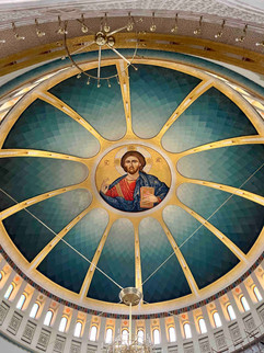 Ceiling mural of Jesus with a facial expression that feels like you just caught his eye in a public bathroom between the small gaps between the doors of a stall while he was taking a holy shit.
