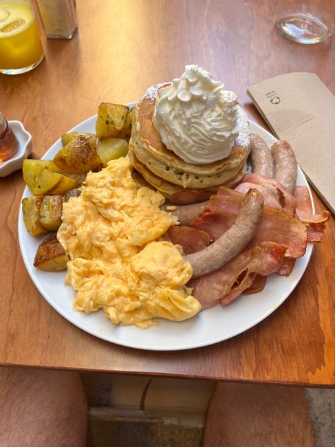 Today, I didn't play basketball, but I did walk into a store with basketball jerseys and apparently that was enough to trigger some long forgotten pavlovian response to eat a huge breakfast. It's like in Jurassic Park where dinosaur DNA was extracted from a mosquito that had been trapped in amber for millions of years. Except instead of finding DNA, they found my hunger and instead of creating an ultimately ill-fated dino-centric theme park, they cooked me a similarly ill-fated eggs, bacon, potatoes, pancakes and sausages.